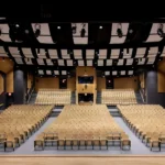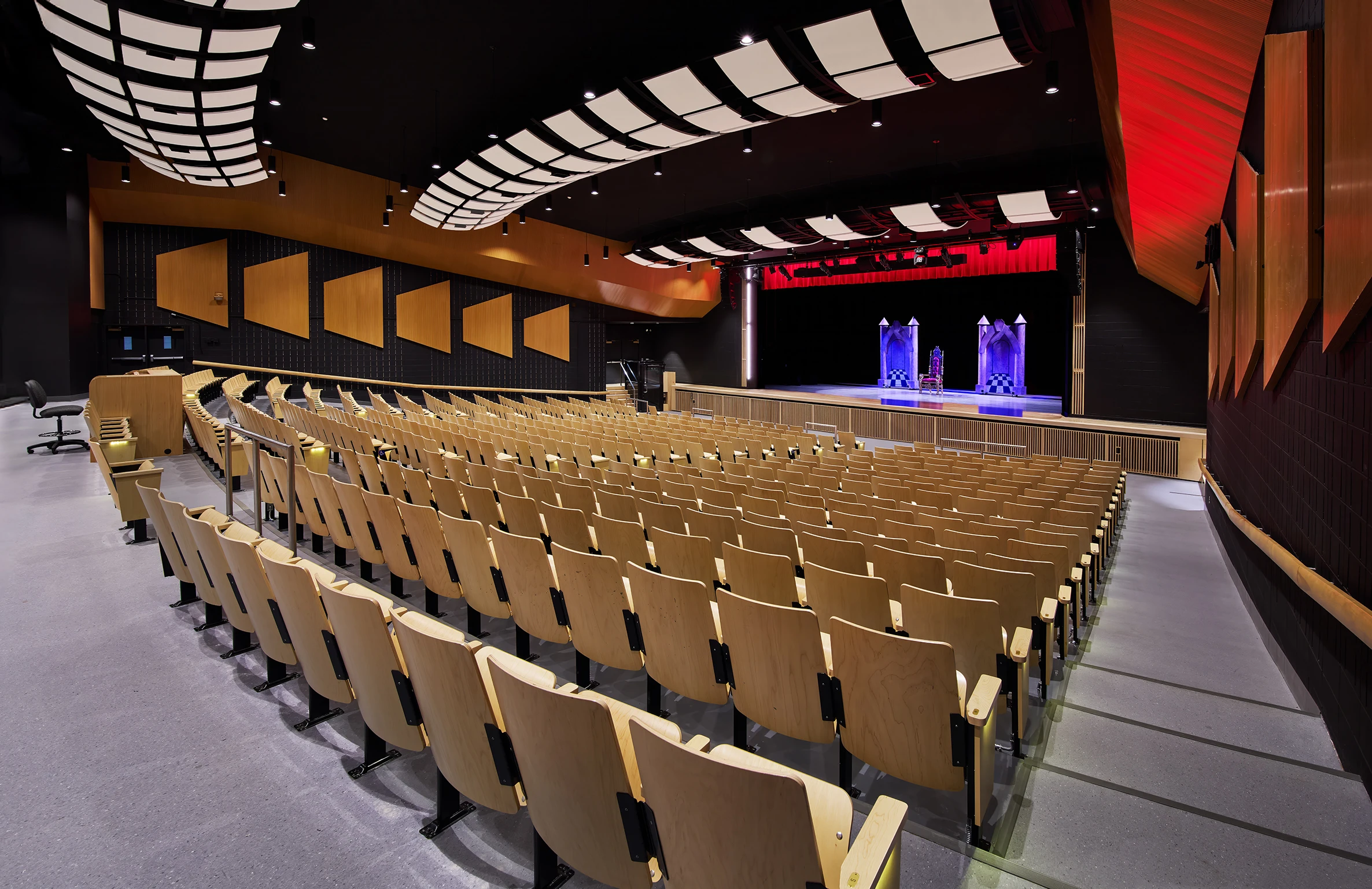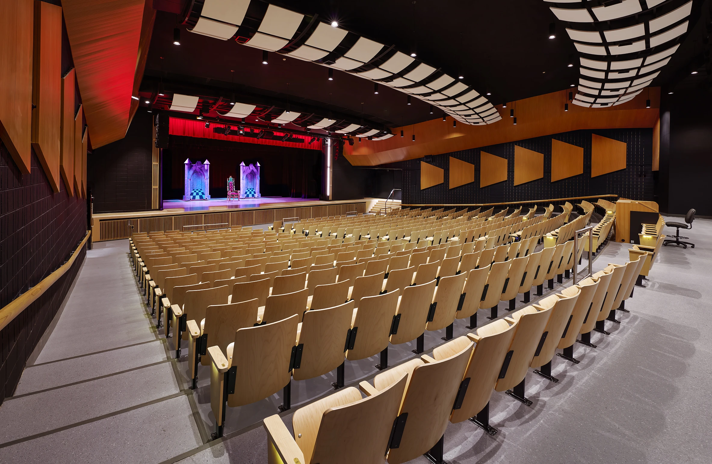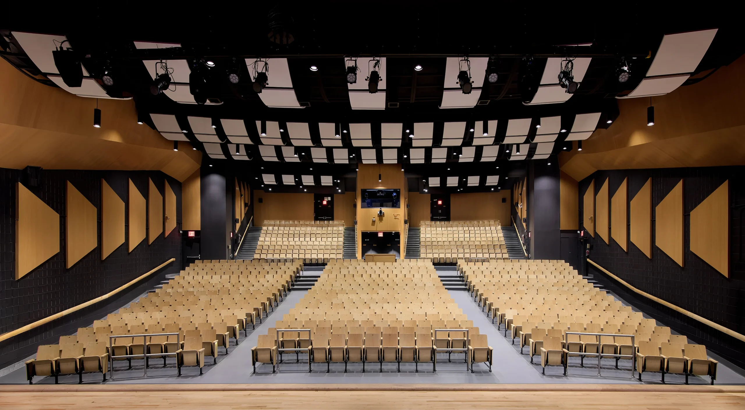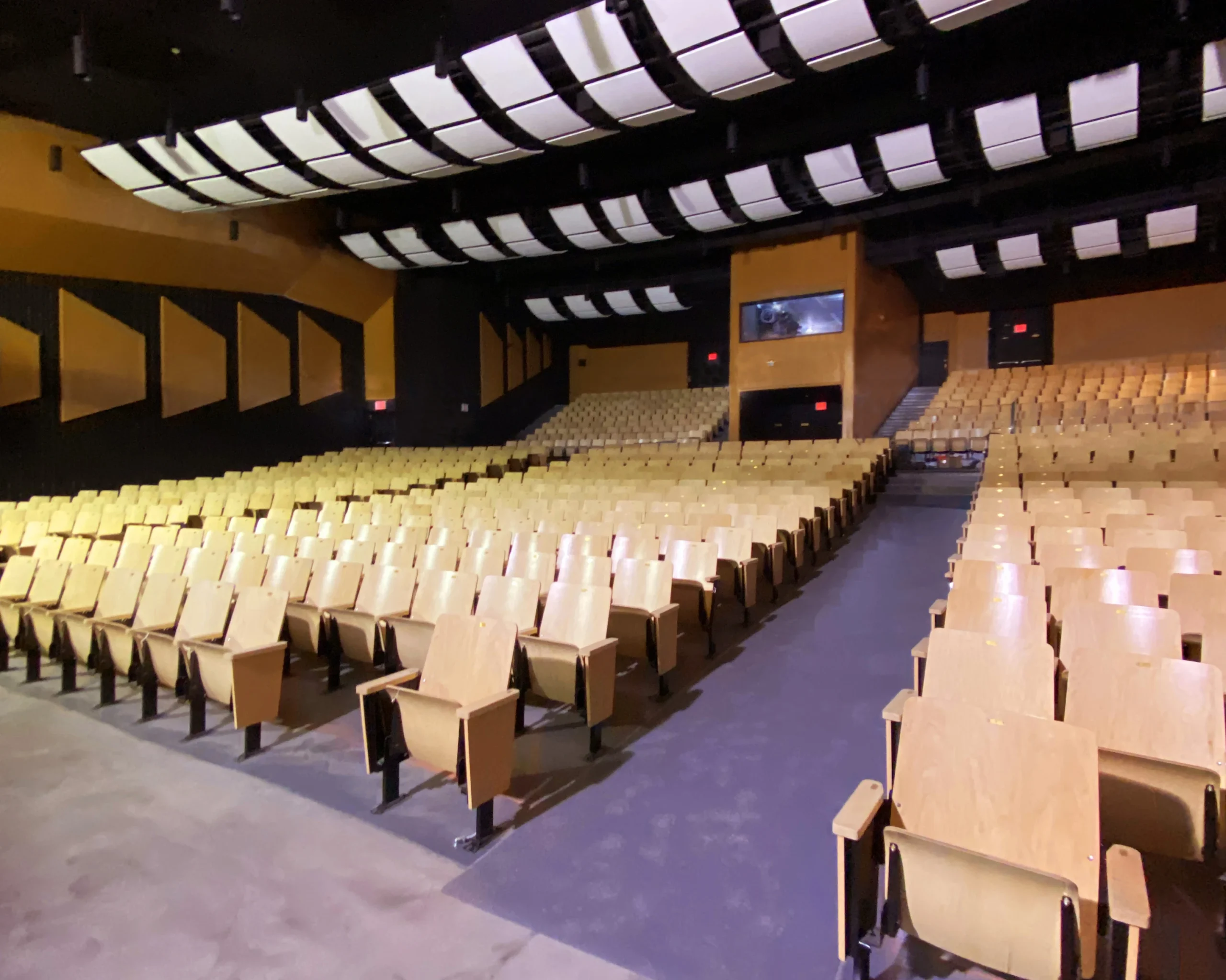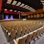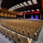 To further enhance acoustic performance, the team conducted a detailed system analysis and implemented architectural acoustic treatments, including suspended acoustical panels at the ceiling level and perforated wood paneling along existing concrete block walls. Additional scope items included replacing all seating, modifying the main hall’s concrete slab to meet ADA standards, and installing an ADA-compliant lift to provide accessible stage access.